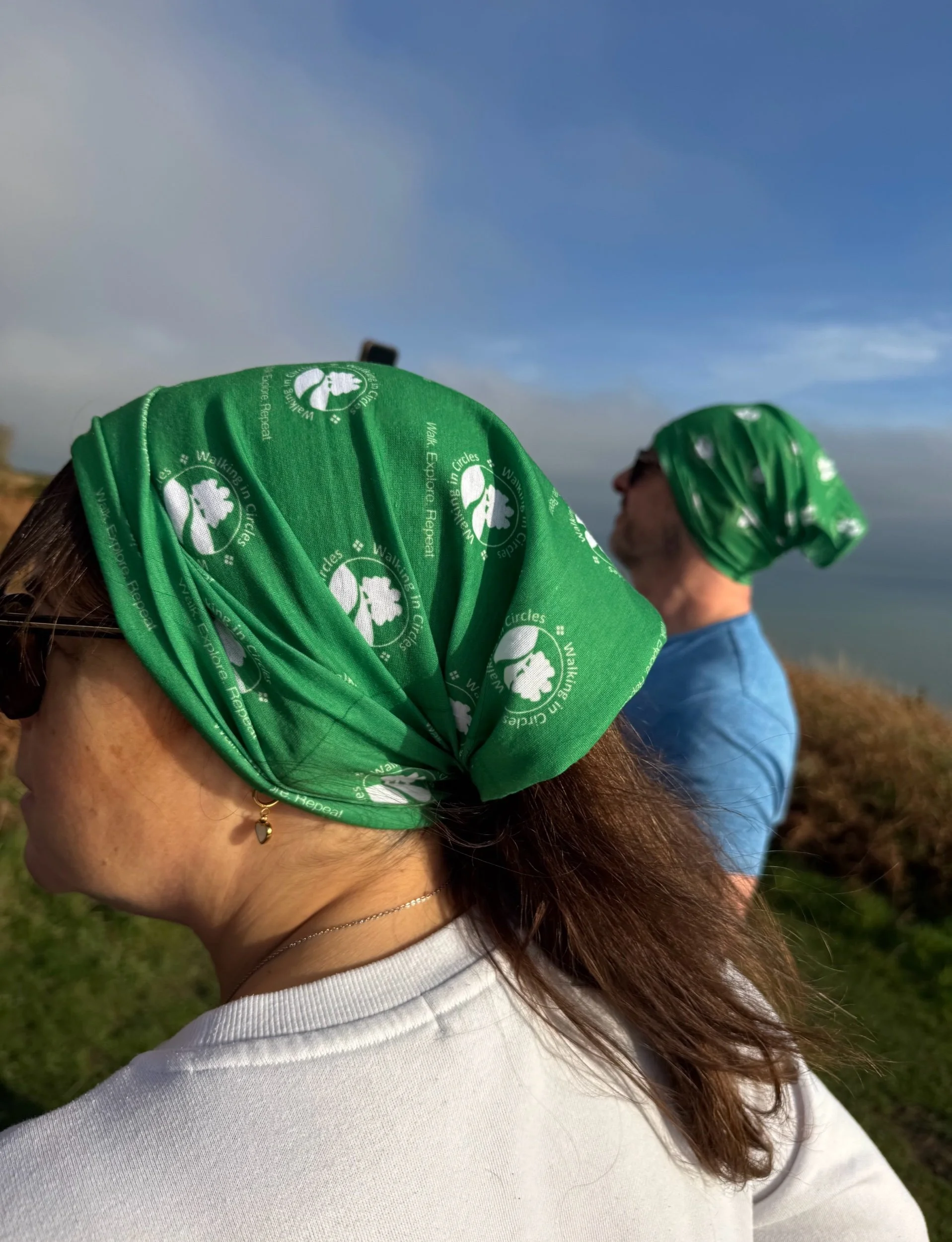 Walking in Circles ‘Walk. Explore. Repeat’ limited edition Bandana Snood 100% Polyester. It’s breathable, and stretchable, and will fit comfortably in any position. Can be worn in numerous ways hence the name!